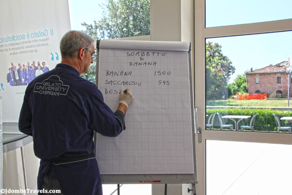 My day at Gelato University began with a lesson by Gelato Maestro Luciano Ferrari in the gelato lab. He first explained how to determine the quality of gelato. It should have gusto, meaning it be taste intense, natural, and fresh. The color should be a natural color. For example, banana should be a grayish color, not bright yellow. And pistachio should be a dull green-gray color, not bright green. Finally, it should be dense yet creamy.