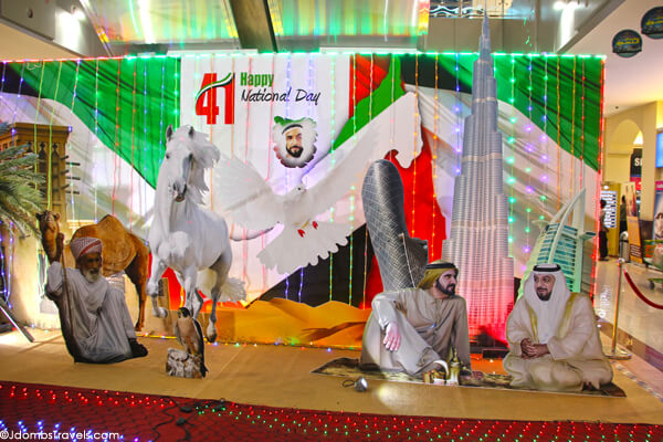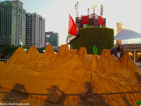 We were told the Corniche was the best place to join in the festivities in the capital, so we headed to the beachfront strip. There we saw thousands of creatively decorated vehicles showing off the country’s colors and adorned with head shots of their beloved Sheikh parading down the streets as they blared their horns. A group of expert sandcastle builders were carving a sand sculpture of the seven founding Rulers of the Emirates. A makeshift souk was set up selling arts and handicrafts as various dancers, singers, and jugglers wowed the crowds.