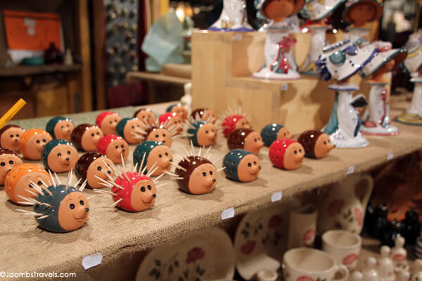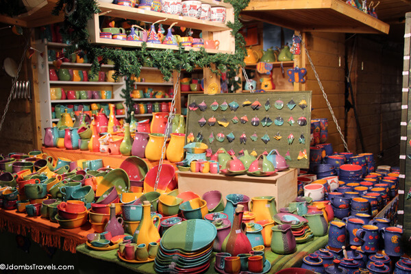 The Budapest Christmas Fair takes place on Vörösmarty Square in the heart of Budapest. We visited after taking a scenic Danube River cruise and despite the pouring rain, it was still lively with a band on the main stage entertaining market goers clutching mugs of mulled wine and hundreds of booths selling traditional Hungarian handicrafts, leather products, and Christmas ornaments.