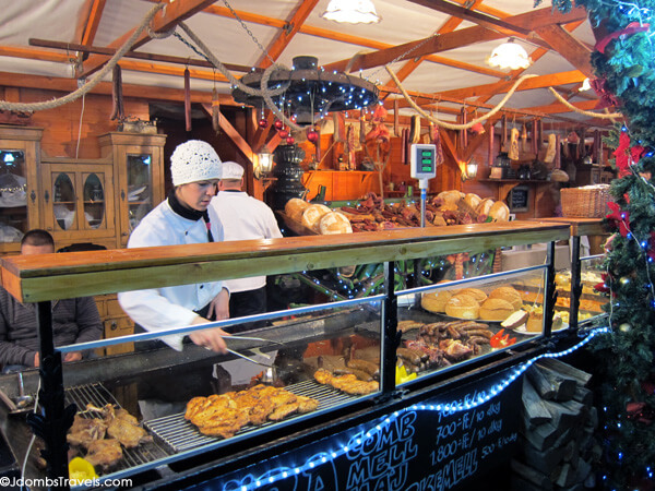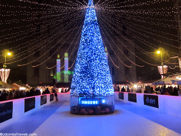 We happily settled in to one of the wooden booths lining the ice rink, the blankets provided and hot mulled wine keeping us warm. We dug into fried Hungarian sausages and homemade Hungarian potato chips while listening to the Christmas music and taking in the beautiful lights in the square.