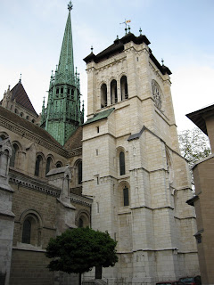 Rue St-Léger curls up into the split-level Place du Bourg-de-Four, a marketplace since Medieval times that was probably built over the Roman forum. We enjoyed a delicious dinner of fine French cuisine at the Au Pied de Cochon, which overlooked the the 18th century facade of the Palais de Justice. (I highly recommend the candied lamb shank with saffron and truffle mashed potatoes!) The site of St. Pierre Cathedral has been occupied at least since the 4th century. Excavations have revealed the remains of two 4th-century Christian sanctuaries, mosaic floors from the late Roman Empire, portions of three early churches, and an 11th-century crypt beneath the present cathedral. The exterior of Geneva’s cathedral exhibits a confusion of styles — it’s a squat Romanesque church with a columned Neoclassical facade, the two square towers on the east end don’t match, and there is a bright green spire (from the late 1800s) rising above everything else.