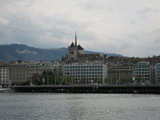 Rue St-Léger curls up into the split-level Place du Bourg-de-Four, a marketplace since Medieval times that was probably built over the Roman forum. We enjoyed a delicious dinner of fine French cuisine at the Au Pied de Cochon, which overlooked the the 18th century facade of the Palais de Justice. (I highly recommend the candied lamb shank with saffron and truffle mashed potatoes!) The site of St. Pierre Cathedral has been occupied at least since the 4th century. Excavations have revealed the remains of two 4th-century Christian sanctuaries, mosaic floors from the late Roman Empire, portions of three early churches, and an 11th-century crypt beneath the present cathedral. The exterior of Geneva’s cathedral exhibits a confusion of styles — it’s a squat Romanesque church with a columned Neoclassical facade, the two square towers on the east end don’t match, and there is a bright green spire (from the late 1800s) rising above everything else.