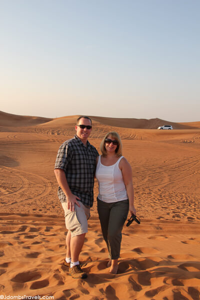 The one place it is a-okay to wear shorts and tank tops in Dubai is when you’re going on a desert safari. Safari trips generally begin in the afternoon (our pick-up was 3pm) to combat desert heat and show you the stunning sunsets in the Arabian Desert. Temperatures can quickly drop once the sun goes down, so I was quite comfortable in cropped pants, a tank top, and a light 3/4 sleeve cardigan that I brought with me for the evening. Wear flip-flops or sandals. The sand is actually wonderful to walk around barefoot in!