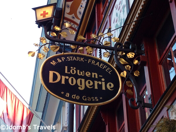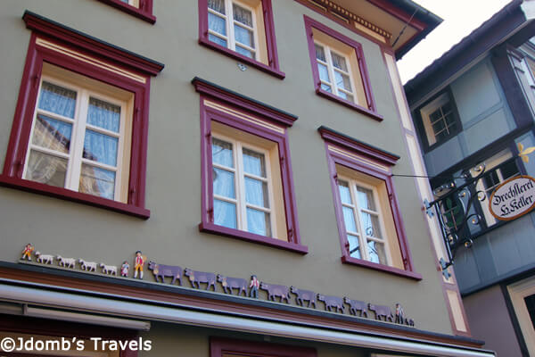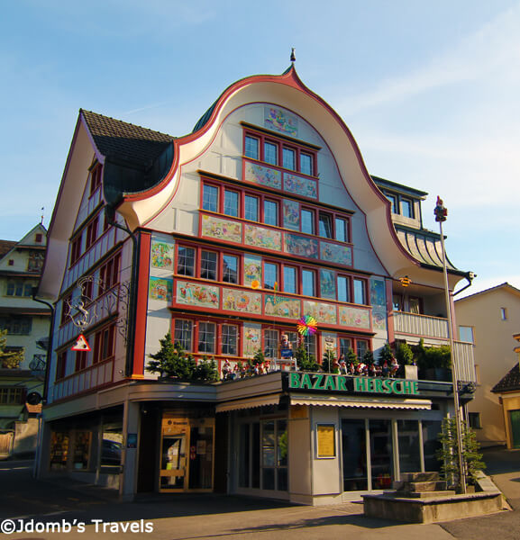 The richly decorated series of panels and emblems on each of Appenzell’s buildings are representative of its history. A Hershey bar emblem stands alongside the gnomes and bubble-blowing teddy bear atop the Bazar Hersche as a reminder that Milton Hershey’s family came from Appenzell and milk chocolate was founded here.