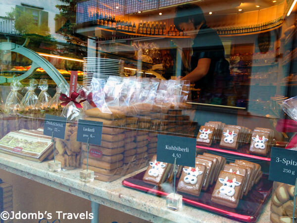 Cows are the center of Appenzell culture. Not only did we find shops selling the famously smelly Appenzeller cheese made from cow milk and a secret mixture of 42 herbs, we also saw huge cow bells on elaborately decorated collars hanging in store windows. The various bakeries in the village display freshly baked treats like gingerbread filled with pears or marzipan, of course adorned with a maripan cow on top!