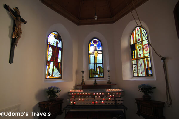Another small church called Heiligkreuzkapelle on the main street, Hauptgasse, was rebuilt after a fire devastated the village in 1560. Its stained glass windows depict the five sorrowful mysteries of the rosary.