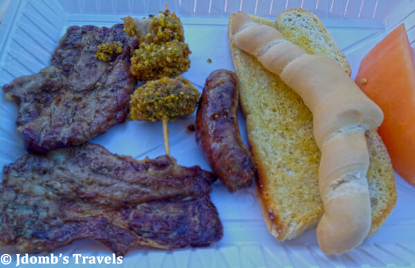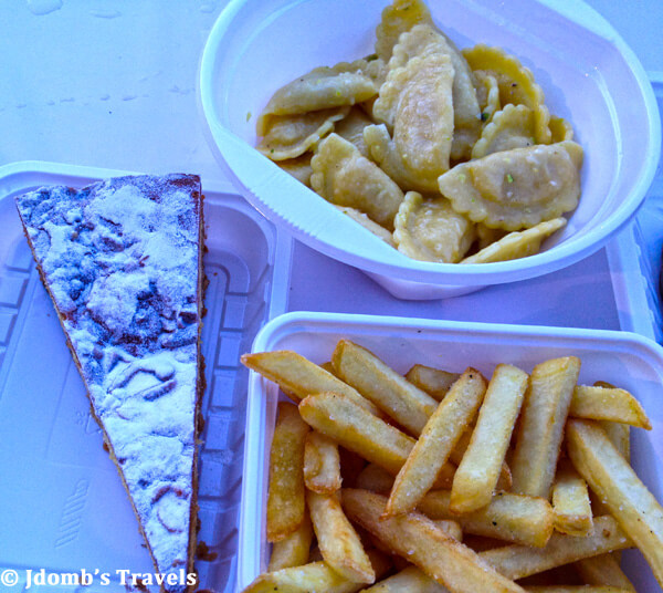 At the garlic festival, a menu fisso ticket costs €18 per person. That may seem expensive, but I totally think the meal is worth it! I eat a very light lunch in anticipation of literally stuffing myself at the garlic festival. The menu fisso includes ravioli in a garlic sauce, french fries seasoned with roasted garlic, garlic bruschetta, garlic sausage, garlic-breaded pork kebob, garlic seasoned steak, a slice of melon, a nectartine, and a nectarine torte for dessert.