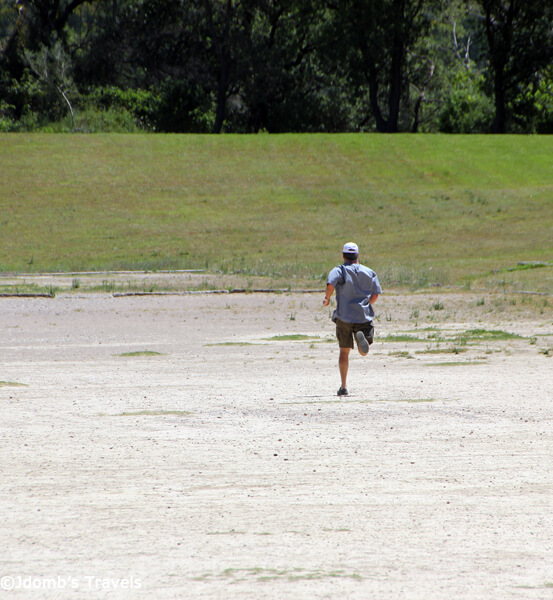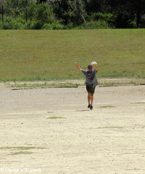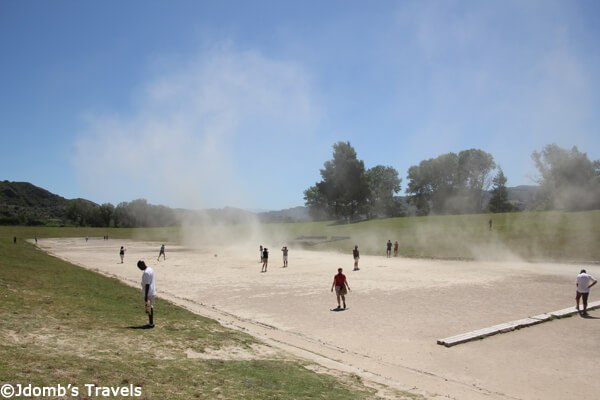 Even though we weren’t part of this tour group, we cheered Mike on as he took off sprinting down the dirt track, dust clouds kicking up and whirling around him from the slight wind. We continued to spur him on as he got smaller and smaller as he neared the other side of the stadium. When Mike made it back to complete his lap, he didn’t get a gold medal, but the tour guide was ready to reward him with a plastic silver crown. Mike proudly accepted, it glinting in the sun as the crowd that had gathered gave him a round of applause.